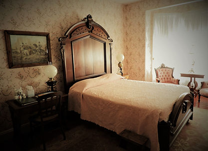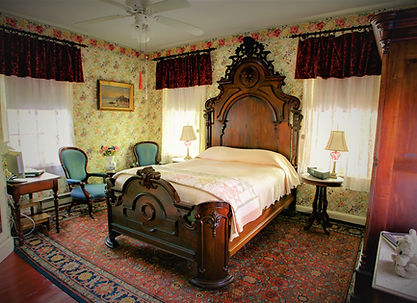 The Cardinal Gibbons Room is named for James Gibbons, the Roman Catholic Archbishop who was elevated to the cardinalate in 1886, and the second American to receive that distinction. He used the Mansion as a Catholic retreat for several summers in the late 1890’s at the turn of the century. This spacious room has twelve-foot ceilings and is furnished with a new california king bed, museum quality dresser, which have been in the building since 1872. The rooms matching Greek revival wardrobes predate the house to the 1820’s. The bedroom also has one of two original chamber pots on a leather covered “slider” under the bed for decorative function only please. The wallpaper is hand silk-screened by Bradbury and Bradbury, and the carpet is a fine hand woven oriental. This room is on the second floor of the mansion and has a bath with tub and shower, central air conditioning with individual control, a 50-inch flat panel TV, and wireless internet access. Parking is provided with this room.